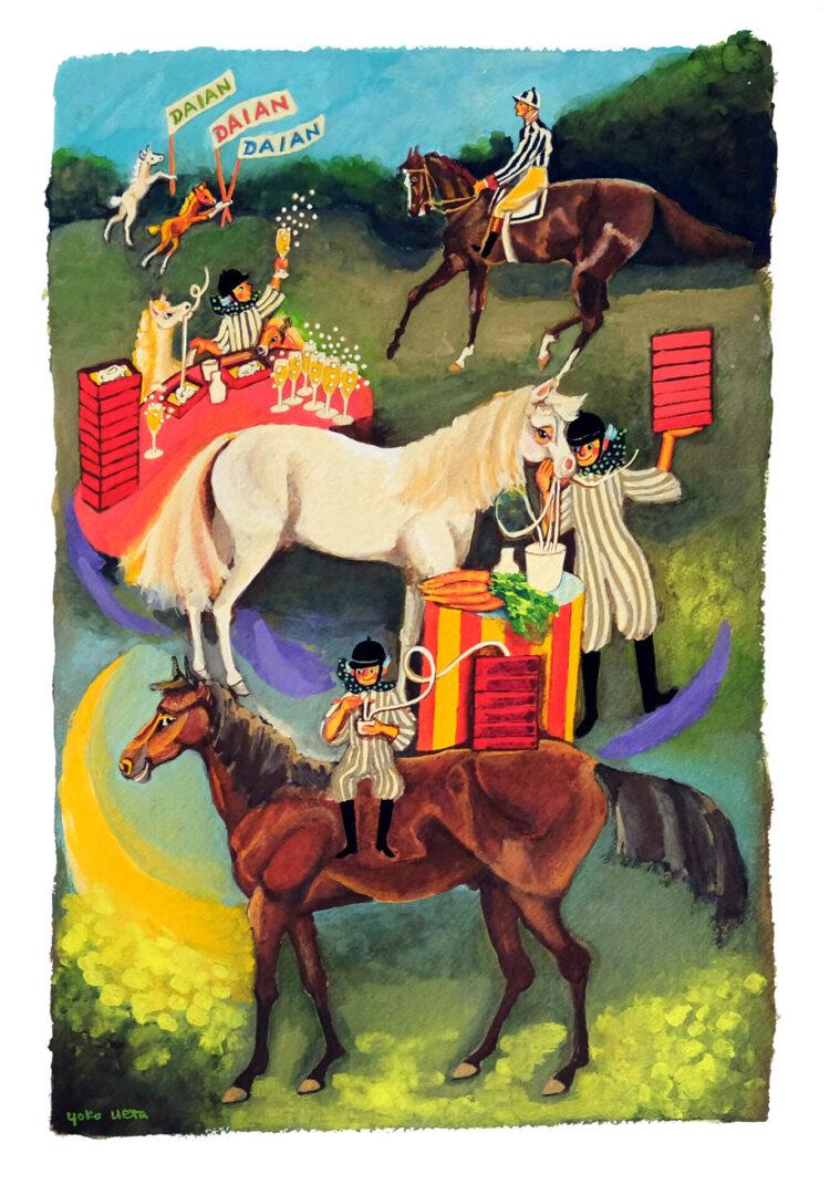 パリ在住の植田洋子さんが、大庵のために賑やかな「午年の絵」を、描いて下さいました。
